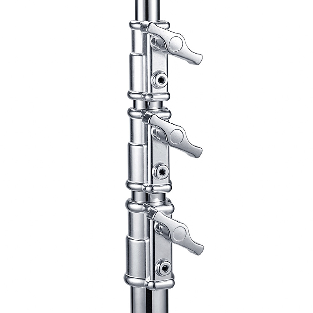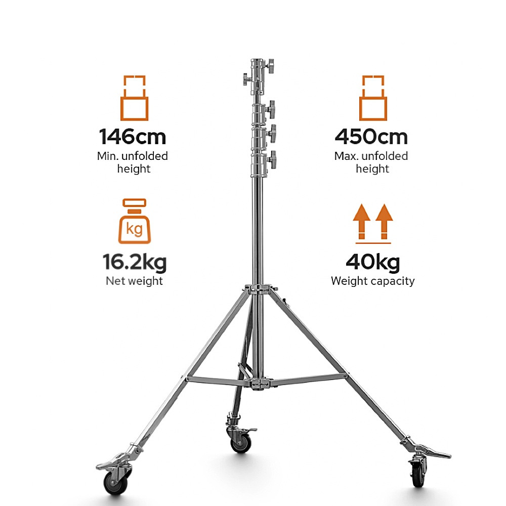 Az állvány összecsukható talppal és kerekekkel rendelkezik, így könnyen mozgatható a stúdióban, miközben kiváló stabilitást biztosít. A magasság 146 cm és 450 cm között állítható, ami lehetővé teszi a világítás pontos pozicionálását akár nagyobb díszletek vagy stúdiókörnyezet esetén is.