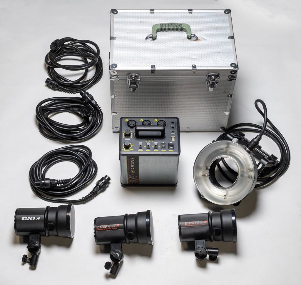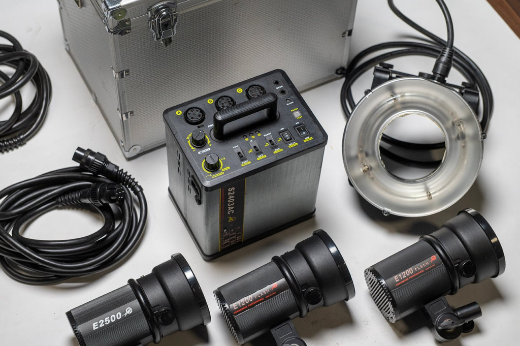 Generátor (S2403Ac), három darab vakufejjel és egy körvakuval, kofferrel.