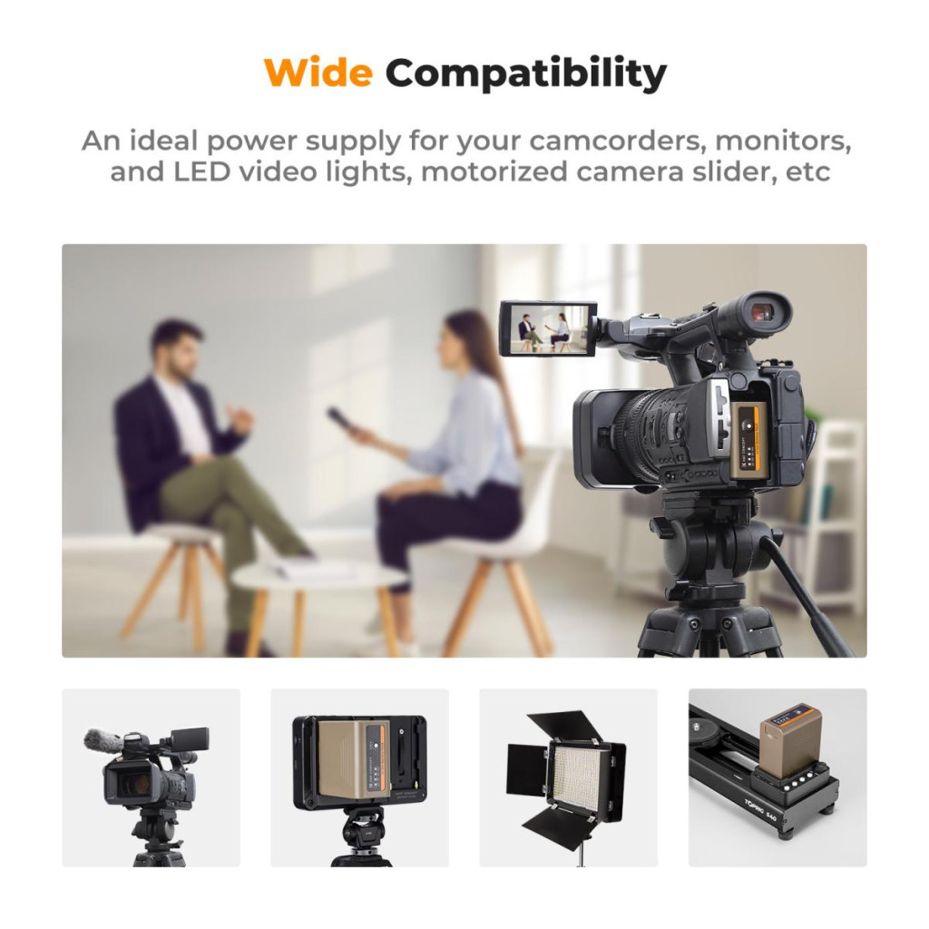Sony pótló akkumulátor: Alkalmas a Sony NP-F550, NP-F570, NP-F750, NP-F770, NP-F930, NP-F950, NP-F960, NP-F970 akkumulátorokat használó Sony modellek pótló akkumulátoraként, valamint LED kamerafényekhez, élő monitorkhoz és csúszkákhoz is.