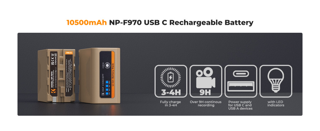 Nagy kapacitású akkumulátor: 7.3V 10500mAh 76.65Wh erős kapacitású NP-F970, beépített kiváló minőségű Li-ion akkumulátorral, hosszú élettartammal, hosszabb üzemidővel, mint az eredeti, alkalmas hosszú távú videó- és fotóprojektekhez, nincs memóriahatás.