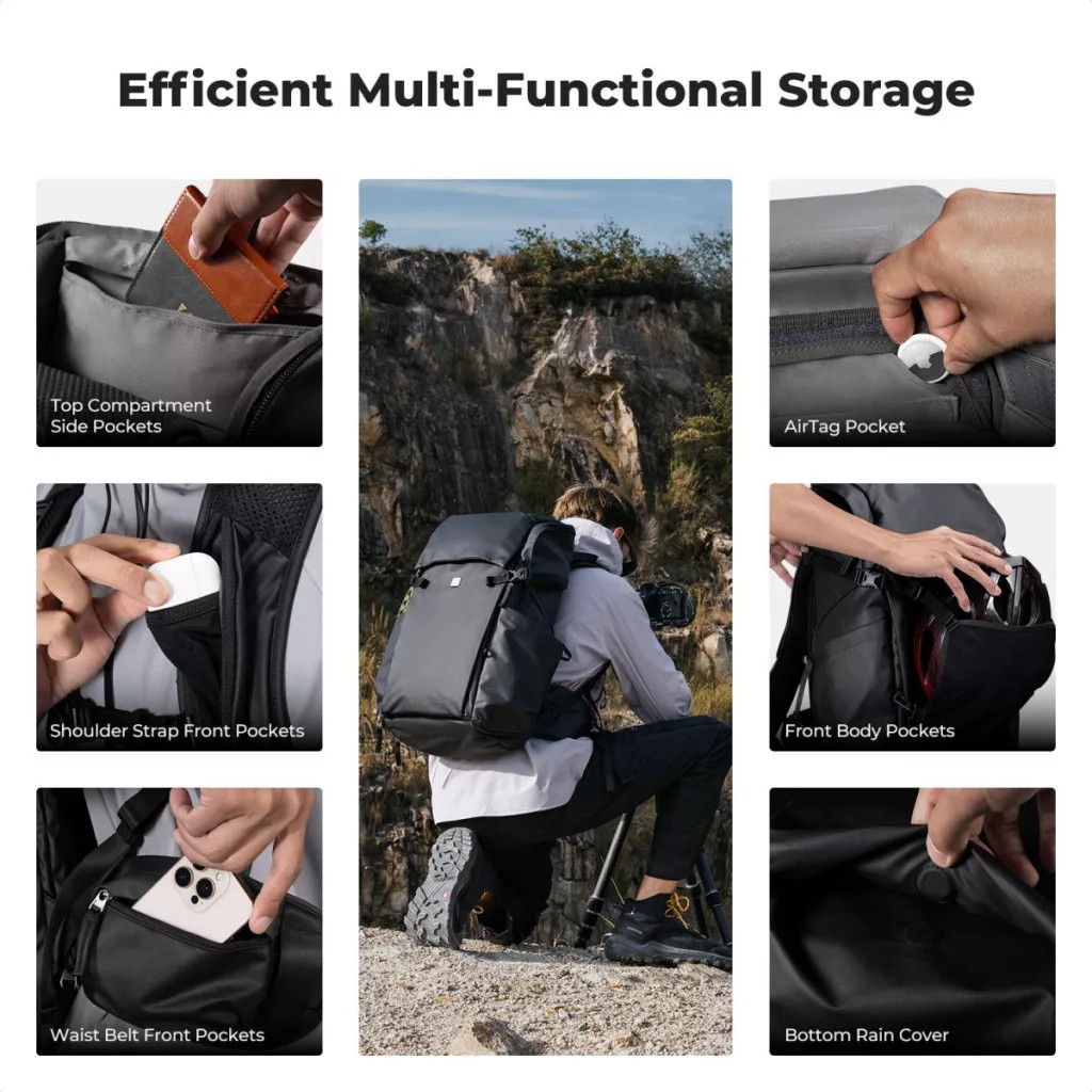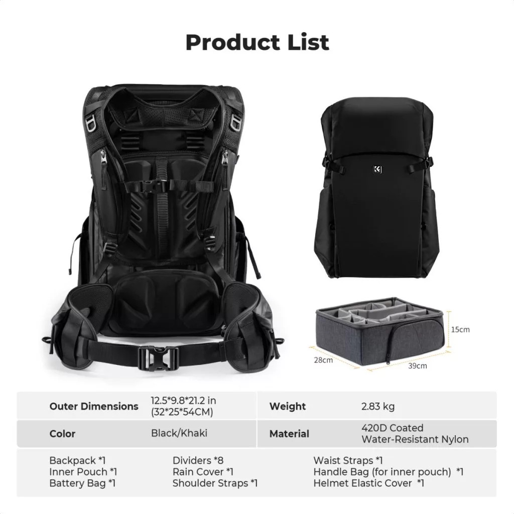 - Professzionális helykihasználás: testre szabható, kivehető elválasztókkal, külön rekeszekkel váz(ak), objektívek, drón, vaku és kiegészítők számára.