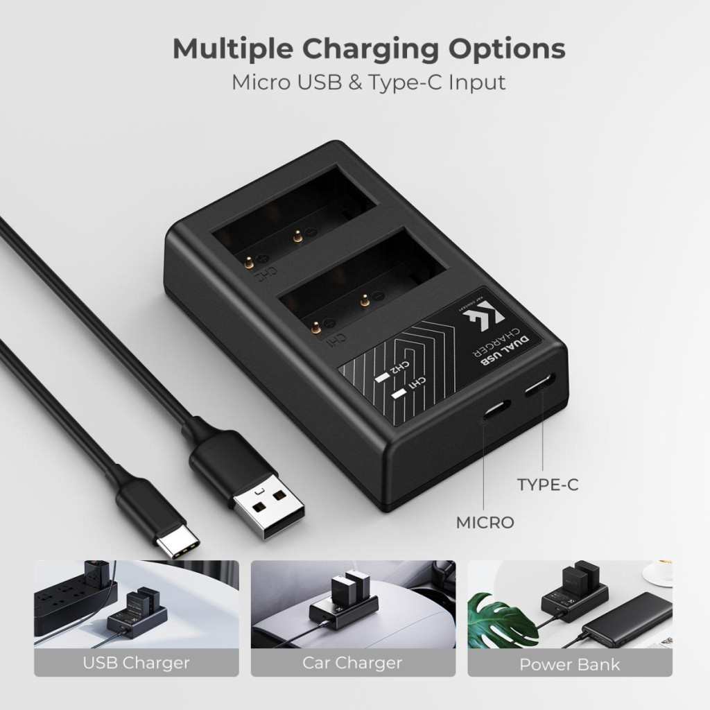 Elegendő energia: Készíts több fényképet, két pótló akkumulátorral felszerelve, így nem kell aggódni a fényképezőgép lemerülése miatt. Használj 5V 2.1A Micro USB/Type C bemeneti töltőt a maximális töltési hatékonyság elérése érdekében.