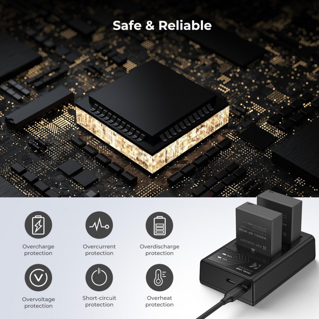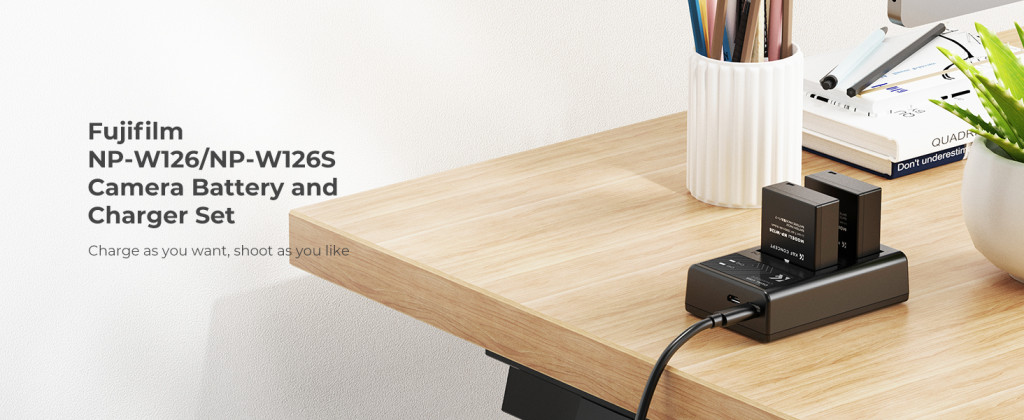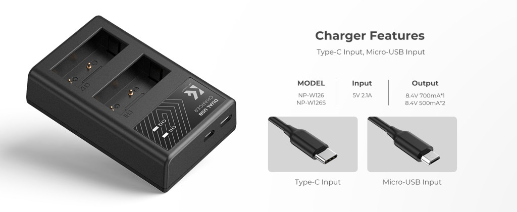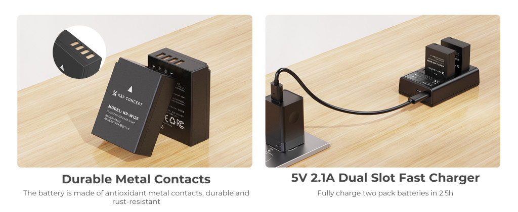 Nagy kapacitás: Két 1300mAh NP-W126 pótló akkumulátor és egy dupla slotos töltő több energiát biztosít a fényképezőgéphez.