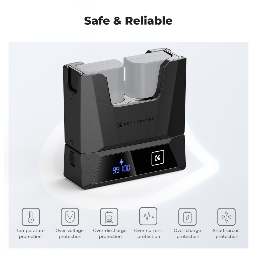 A K&F Concept hordozható moduláris dupla töltő ideális választás profi és hobbi fotósok számára, akik Canon LP-E6NH akkumulátorokat használnak. Praktikus, helytakarékos kialakítása, gyors töltési funkciója és intelligens kijelzője révén egyszerre biztosítja a hatékonyságot és a kényelmet.