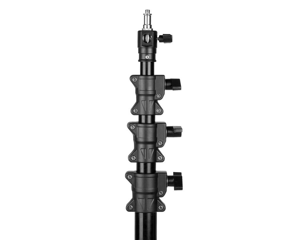 Nagyméretű, széles terpesztésű, stabil vakuállvány. Minden szekciója légcsillapítással ellátott, a biztonságos összezárásért. 3,3 kg-os súlyával még hordozható, ha mindenképpen egy erős, magas állványra van szükségünk kültéren is.