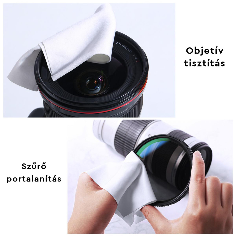 Jól használható, professzionális tisztítókendő, mellyel könnyedén távolíthatja el a szennyeződéseket fényképezőgép lencséről/szűrőről.
