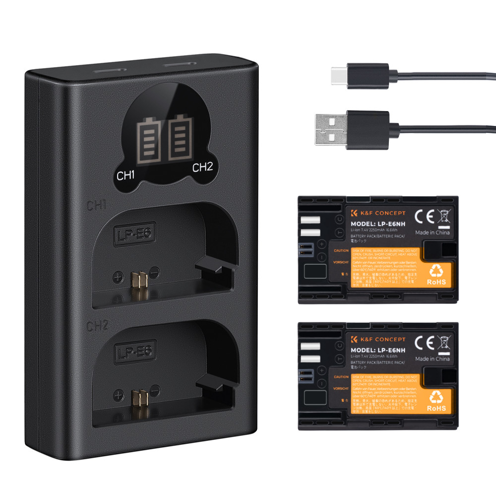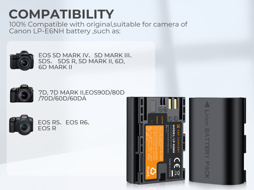 Kompatibilitás: A K&F CONCEPT Canon LP-E6NH akkumulátor kompatibilis olyan Canon fényképezőgépekkel, amelyek LP-E6NH/LP-E6N/LP-E6 akkumulátort használnak, például Canon EOS R5, EOS R6, EOS R, EOS 5D Mark IV, 5D Mark III, 5DS, 5DS R, 5D Mark II, 6D, 6D Mark II, 7D, 7D Mark II, 90D, 80D, 70D, 60D, 60Da. (Megjegyzés: Csak részleges modell lista.)