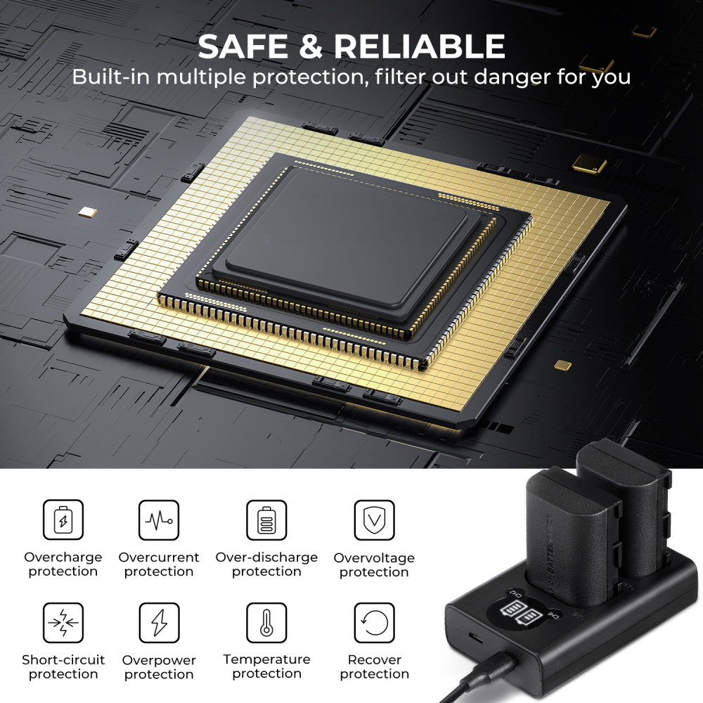 Intelligens töltés: Az LCD kijelző megjeleníti az akkumulátor töltési állapotát, és a töltési folyamat során intelligens chipet használ az akkumulátor hatékonyabb védelme érdekében; a dupla töltőport egyszerre két akkumulátort tud gyorsan tölteni, jelentős időt takarítva meg.