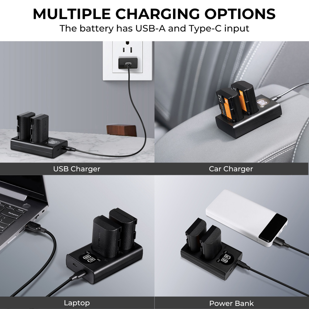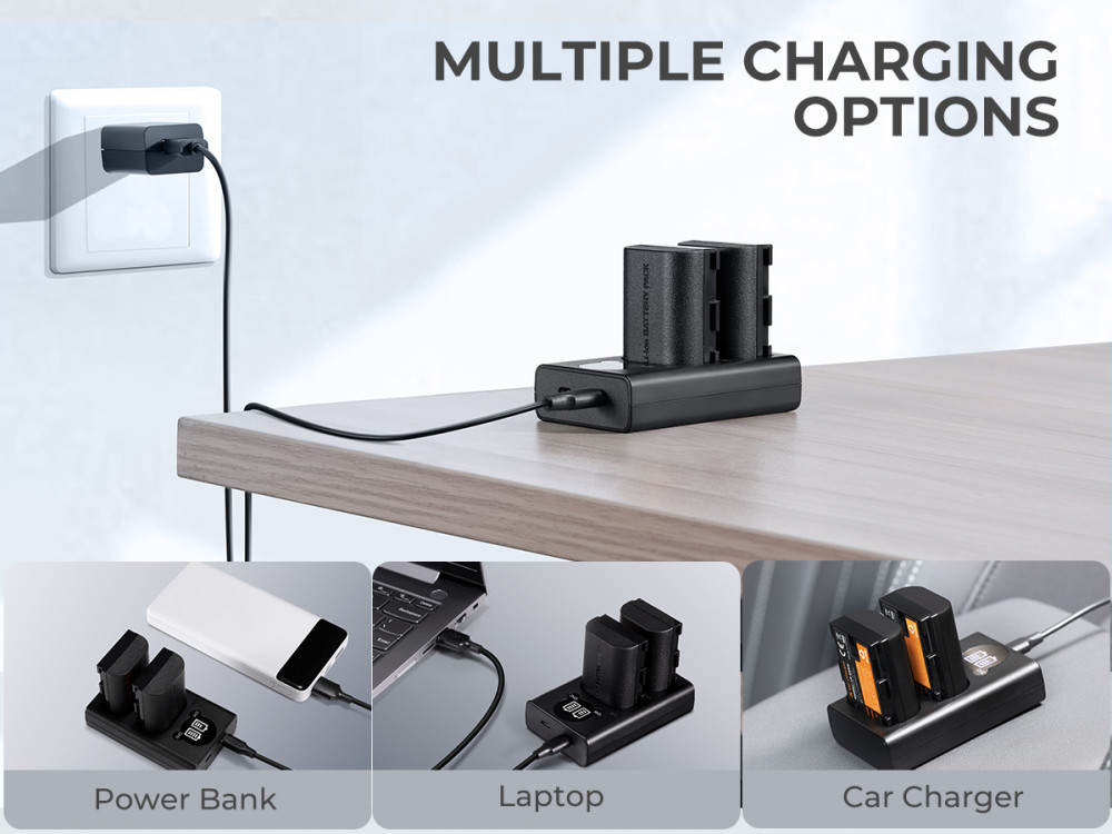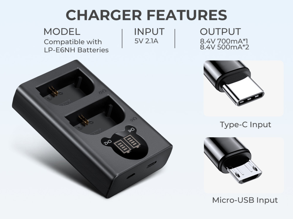 Praktikus: A töltő készlet tartalmaz 2 db 7,4V 2250mAh Sony LP-E6NH csereakkumulátort és mikro USB/Type C dupla interfészű töltőt, támogatja a fali, otthoni töltést, illetve az autós töltési lehetőséget. Kompakt méretének és praktikus kialakításának köszönhetően könnyedén hordozható.