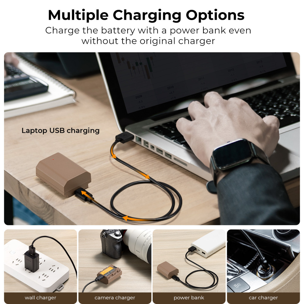 Töltési lehetőségek: A Type C töltőkábellel az eszköz közvetlenül is tölthető, valamint kompatibilis az NP-FZ100 töltővel, továbbá tölthető USB falitöltővel, autós töltővel vagy külső akkumulátor segítségével is. Az akkumulátor rendelkezik egy töltési jelzőfénnyel, a piros fény jelzi, hogy a töltés folyamatban van, a zöld fény pedig, hogy az eszköz teljesen feltöltött.