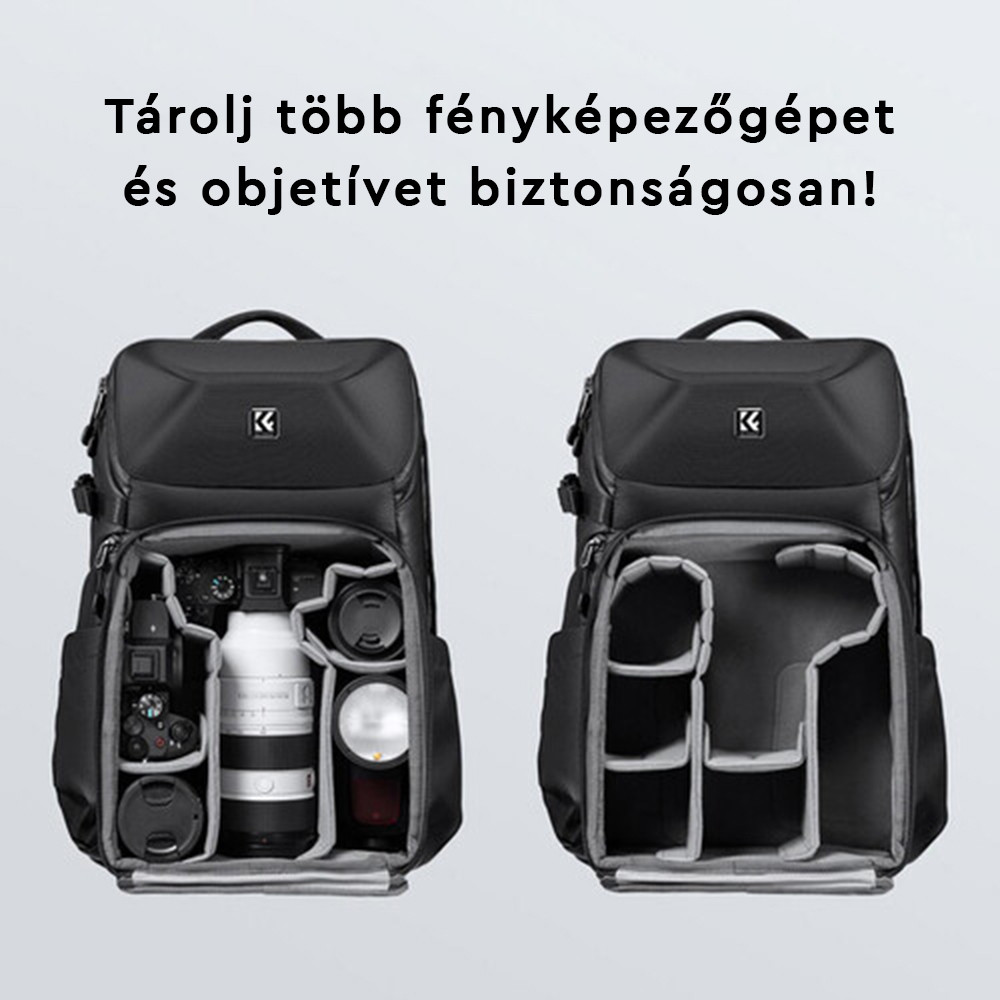 A fekete, 20 literes, K&F Concept Beta Photography Backpack hátizsákot kifejezetten arra tervezték, hogy tárolja és megvédje fényképezőgépét és objektíveit.