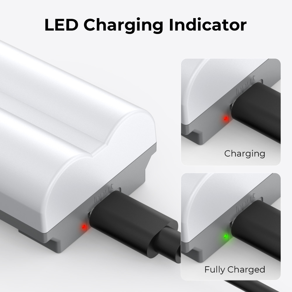 Töltési lehetőségek: A Type C töltőkábellel az eszköz közvetlenül is tölthető, valamint kompatibilis az NP-W235 töltővel, továbbá tölthető USB falitöltővel, autós töltővel vagy külső akkumulátor segítségével is. Az akkumulátor rendelkezik egy töltési jelzőfénnyel, a piros fény jelzi, hogy a töltés folyamatban van, a zöld fény pedig, hogy az eszköz teljesen feltöltött.
