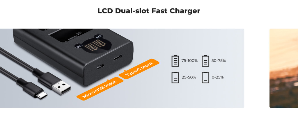 Többféle töltési módszer: A töltő Micro USB és Type C portokkal rendelkezik, és tölthető fali töltővel, autós töltővel vagy mobil akkumulátorral. Az akkumulátort közvetlenül a Z50 fényképezőgépben is töltheted.