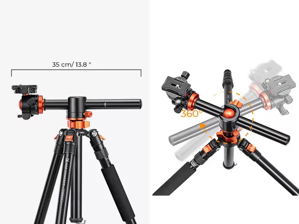 A K&F Concept T255A3 + BH-28L egy sokoldalú, prémium kategóriás állvány, amely tripodként és monopodként is használható. A masszív alumínium konstrukció kiváló stabilitást biztosít, miközben a könnyű kialakítás lehetővé teszi a kényelmes szállítást. A vízszintes középoszlop révén ideális választás felülnézeti (top-down) fotózáshoz, termékfotókhoz és kreatív beállításokhoz.