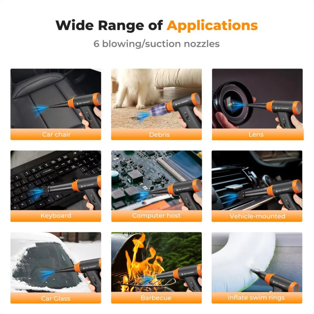 Sokoldalú, 14 az 1-ben sűrített levegős tisztító eszköz, amely hatékonyan távolítja el a port és szennyeződéseket elektronikai eszközökről és nehezen elérhető helyekről. Kompakt és újratölthető kialakítása praktikus megoldást kínál otthoni és professzionális használatra.