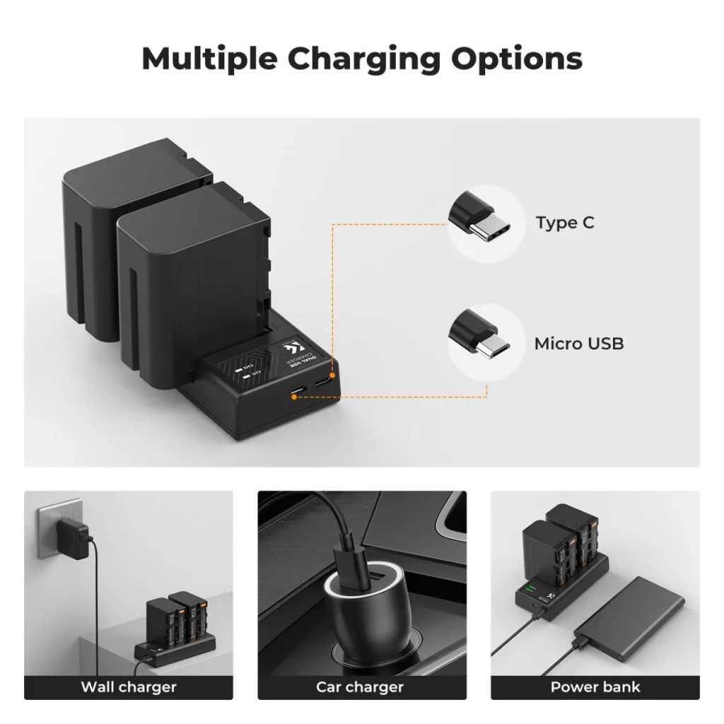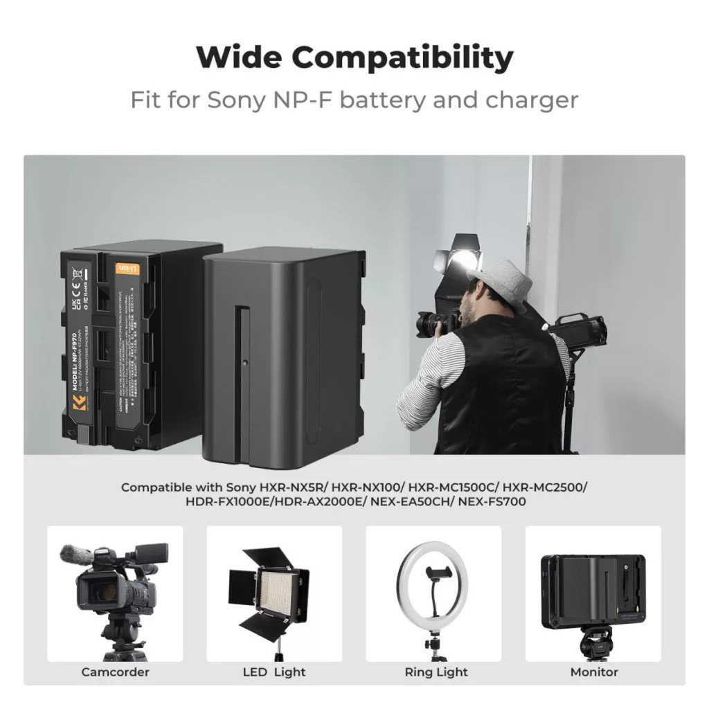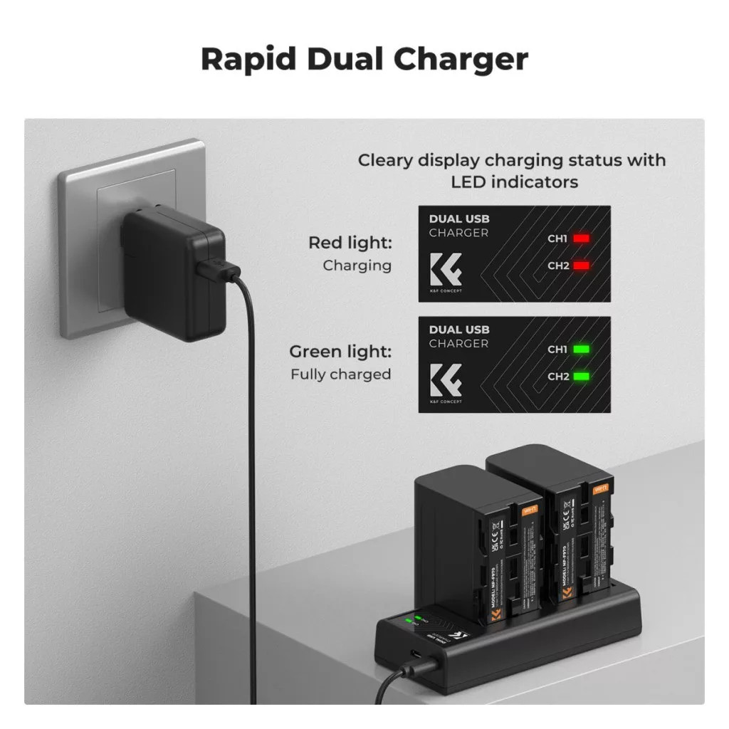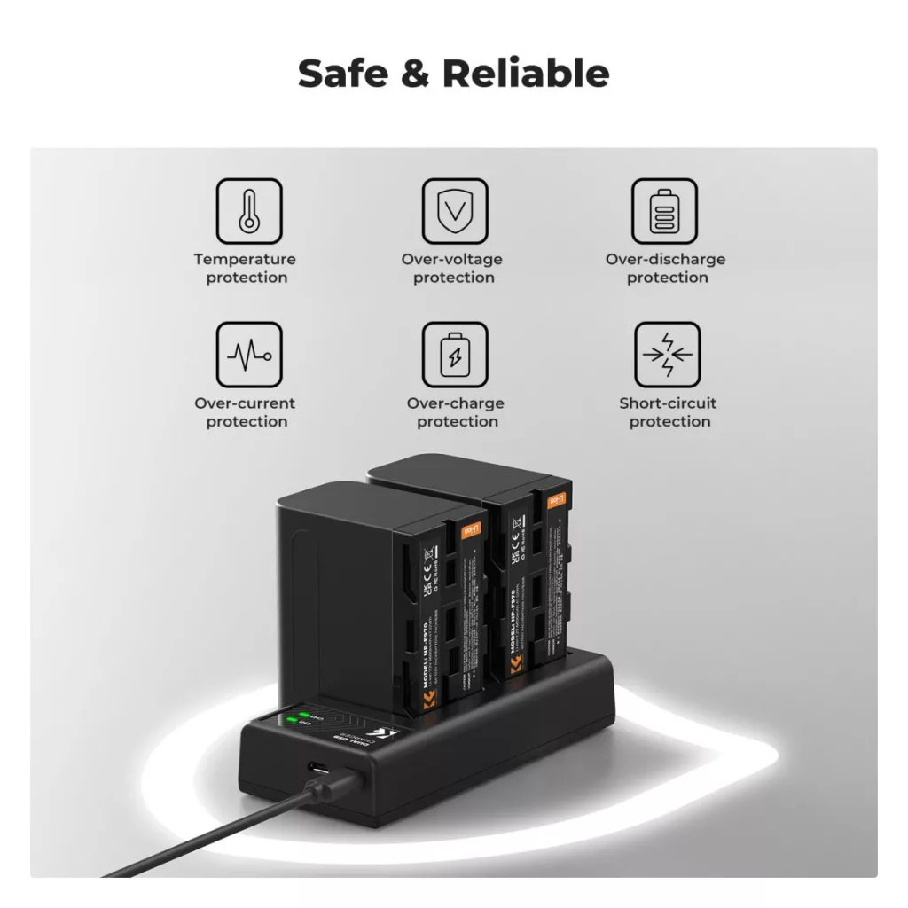 A K&F Concept szettje két NP-F970 (6600 mAh) kapacitású akkumulátort és egy hordozható, USB-C tápellátású töltőt tartalmaz. Megbízható energiaforrás hosszú forgatásokhoz, interjúkhoz és stúdiómunkához, ahol a folyamatos üzemidő kiemelten fontos.