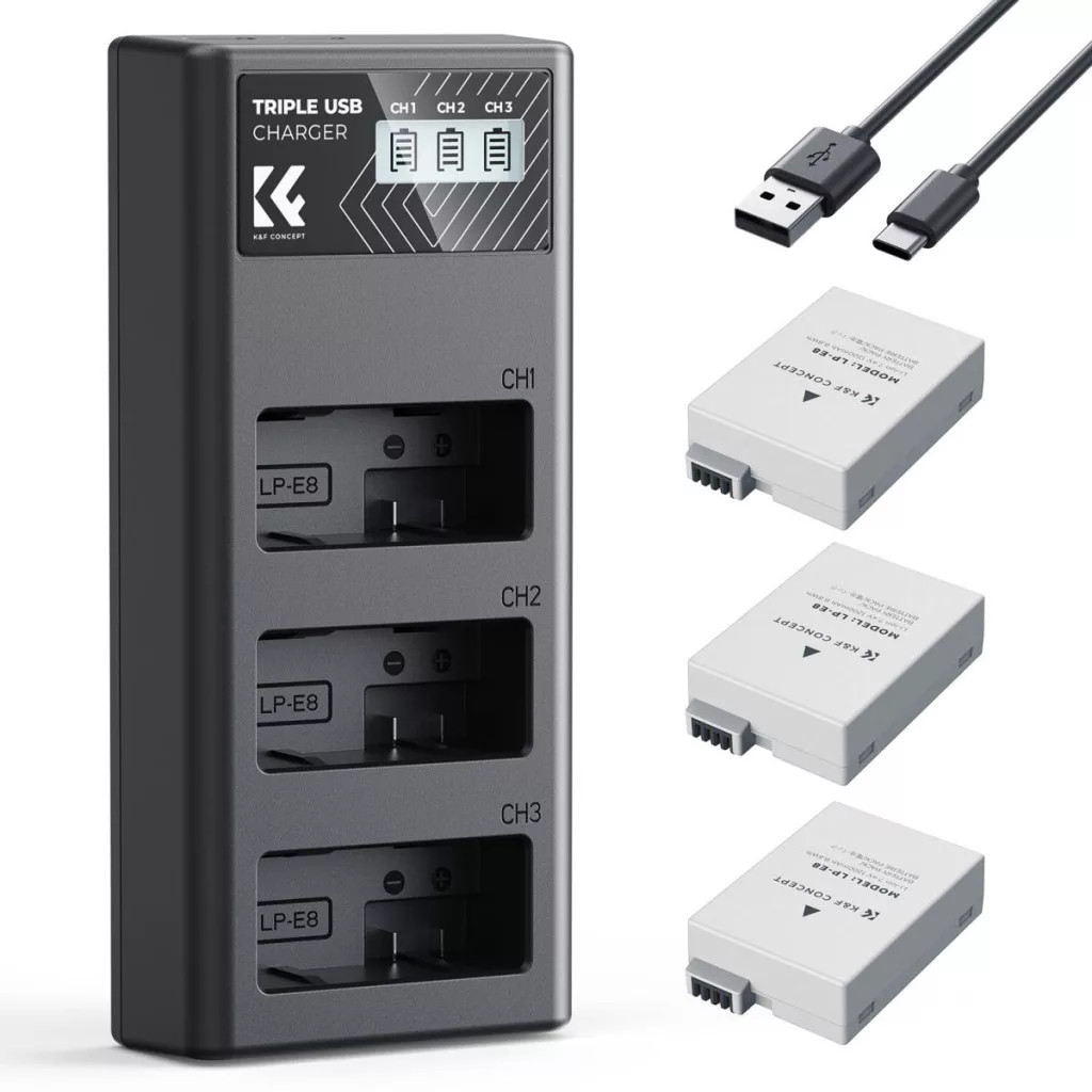 K&F Concept hordozható tripla USB-C akkumulátor LC-E12E töltő, LCD + 3db LP-E8 akkumulátor 1200mAh (KF-28-0099)