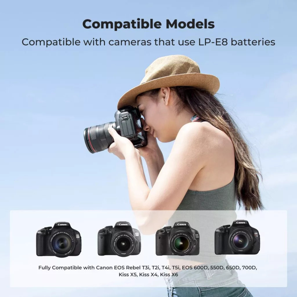 • Kompatibilis az LP-E8 akkumulátort használó Canon EOS modellekkel (például Rebel T2i, T3i, T4i, T5i, 550D, 600D, 650D, 700D)
