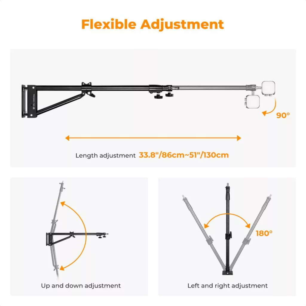 falra szerelhető háromszög boom kar 130 cm-es hosszal, amely stabil tartást biztosít lámpák és egyéb fotós eszközök számára. 180°-ban állítható kialakítása rugalmas pozicionálást tesz lehetővé, ideális stúdió- és tartalomgyártási környezethez.