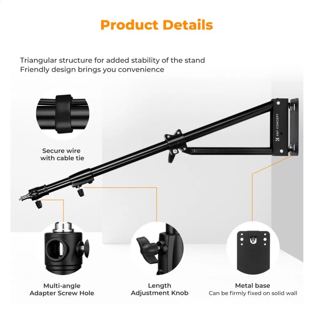 A K&F Concept fali boom kar lehetővé teszi a professzionális világítási rendszer kialakítását stabil és biztonságos módon. A nagy méret és az állítható kar maximális rugalmasságot biztosít, míg a masszív szerkezet garantálja a megbízható használatot. Ideális választás minden olyan környezetbe, ahol fontos a hatékony helykihasználás és a precíz világítás.