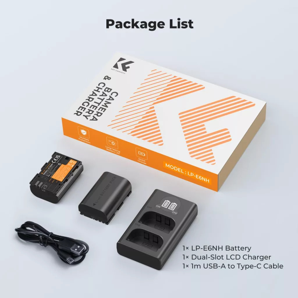 A K&F Concept prémium szettje azoknak készült, akik megbízható energiaforrást keresnek fotózáshoz vagy videózáshoz. A csomag két darab LP-E6NH típusú, 2600 mAh (megadott kapacitás) akkumulátort tartalmaz, továbbá egy USB-C csatlakozású töltőt. Kompatibilis számos Canon EOS fényképezőgéppel, amelyek LP-E6-sorozatú akkumulátort használnak.