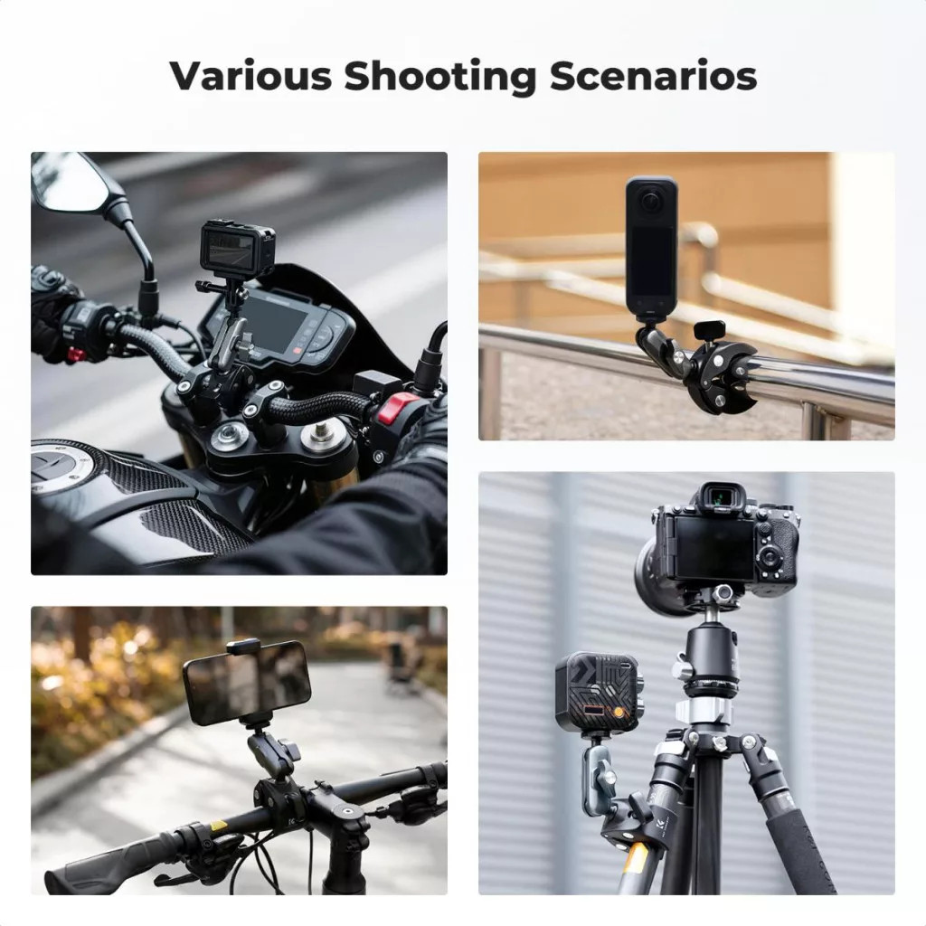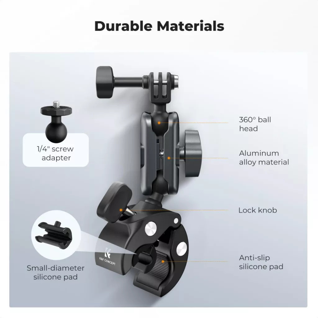 A K&F Concept super clamp egy sokoldalú és masszív kameratartó megoldás, amely lehetővé teszi különböző eszközök stabil rögzítését csövekre, rudakra vagy egyéb felületekre. A dupla gömbfejes kialakítás teljes szabadságot biztosít a kamera pozicionálásában, így könnyedén beállítható a kívánt szög. Ideális választás kerékpárra, motorra, állványra vagy akár egyéb speciális rögzítési helyzetekhez.